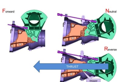 'Bucket' systems:- Deflect and vector the thrust of water from the jet pump nozzle in several directions when in reverse. The vents on the side are designed to provide maximum turning thrust.