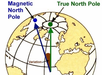 True North is where the Longitude Lines meet at the North Pole. Magnetic North is where our compass points which is towards the Magnetic North Pole; how much variation and whether it lies to the East or West depends on where we are in the world. Variation is shown on the Compass Rose on your Chart.