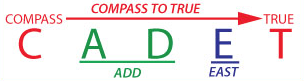 I.E. when the Variation is East you SUBTRACT it from your True Bearing in order to gain your Magnetic Bearing. ; if the Variation is West you ADD it to your True Bearing in order to gain your Magnetic Bearing.