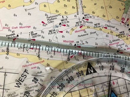 4) TURN THE PLOTTERS COMPASS UNTIL THE 'N' IS POINTING TO NORTH ON THE CHART